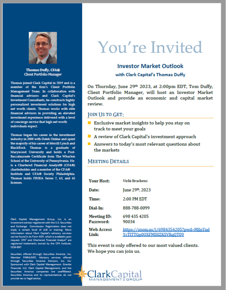 On Thursday, June 29th 2023, at 2:00pm EDT, Tom Duffy, Client Portfolio Manager, will host an Investor Market Outlook and provide an economic and capital market review.
